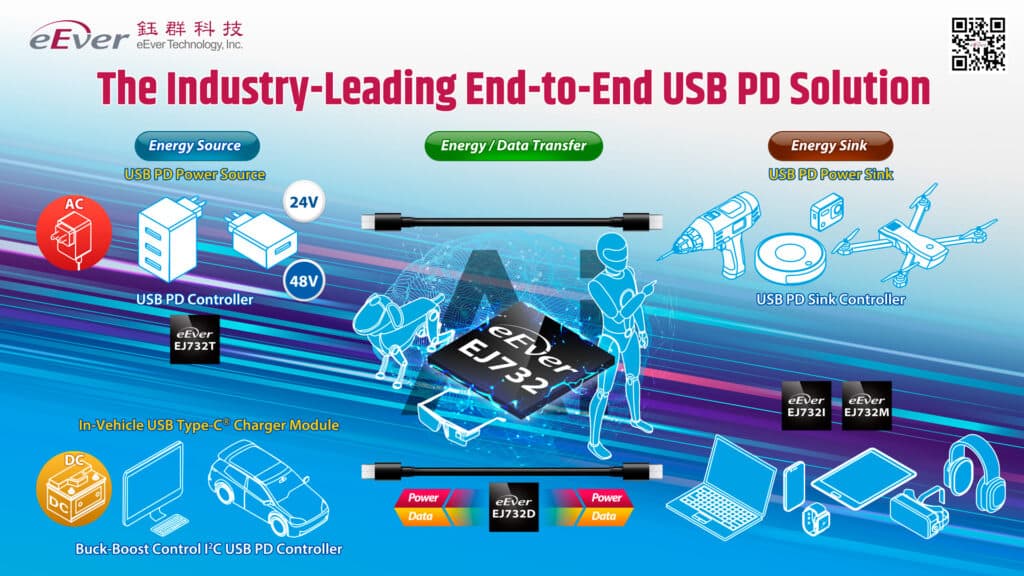 The eEver EJ732 family USB Power Delivery (PD) Controller has officially received USB-IF PD3.2 certification as of October 9, 2024 (TID: 11771). With this certification, the EJ732 family aligns with the USB Power Delivery 3.2 (PD3.2) standard, supporting efficient power negotiation through a single USB Type-C connection, making it ideal for modern, high-power devices.