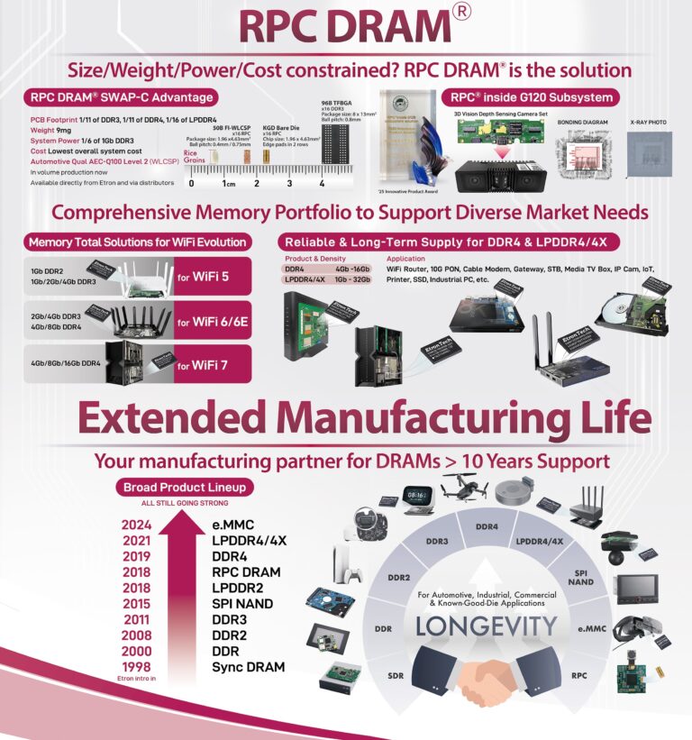 Etron’s complete memory solutions can fully satisfy customer needs ranging from Wi-Fi 5, Wi-Fi 6/6E, Wi-Fi 7, and beyond. Additionally, Etron’s deep strategic alliances with supply chain partners enable us to provide customers with a long-term and reliable supply of DDR4 & LPDDR4/4X products.