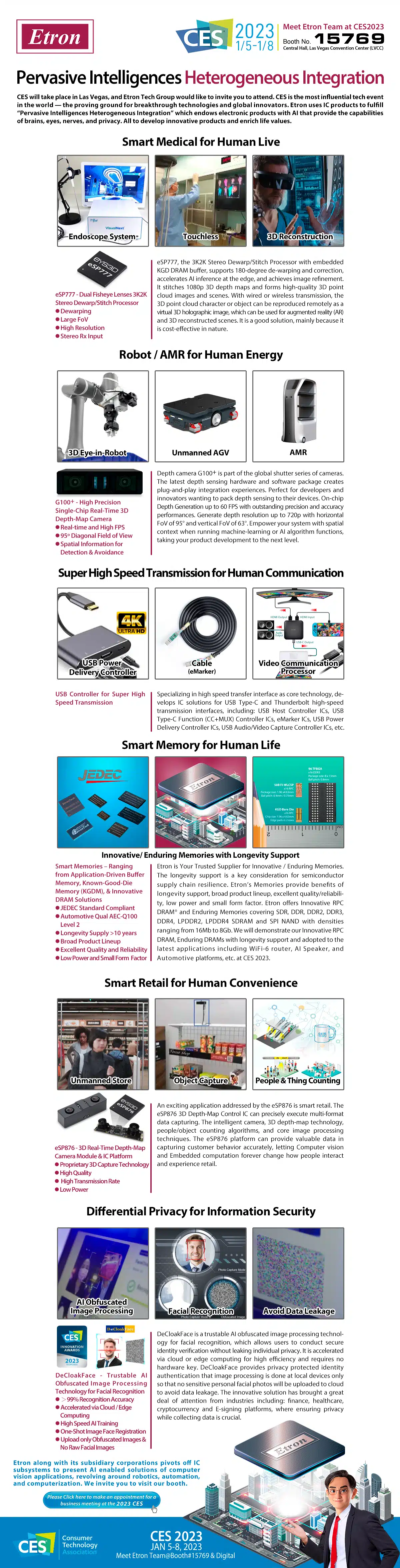 CES will take place in Las Vegas, and Etron Tech Group would like to invite you to attend. CES is the most influential tech event in the world — the proving ground for breakthrough technologies and global innovators. Etron uses IC products to fulfill “IntelligenceN Heterogeneous Integration for All,” which endows electronic products with AI that provide the capabilities of brains, eyes, nerves, and privacy. All to develop innovative products and enrich life values.