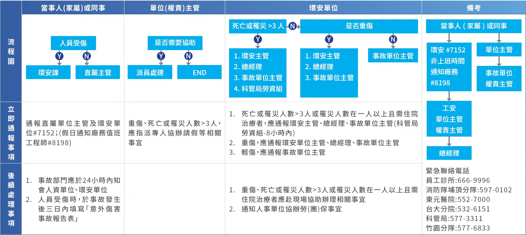 制定火灾、天灾 (地震与颱风)、电力中断、气体洩漏、化学品洩漏、重大传染病等紧急应变计画, 并购置相关防护器材与实施演练