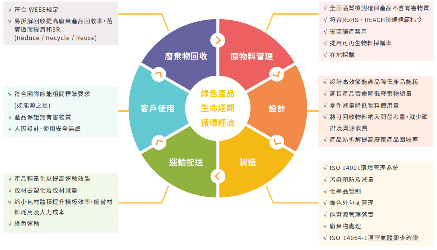 為確保本公司產品符合國際環保法規(RoHS,REACH…)及客戶綠色產品要求,進而避免對環境造成污染以及危害人體健康,本公司已成立了跨部門之限禁用有害物質管理團隊參與及管制產品之設計、採購、生產及銷售等相關流程,並要求供應商、外包商,將綠色產品要求納入其管理,以提供未含有害物質之產品及滿足客戶要求。